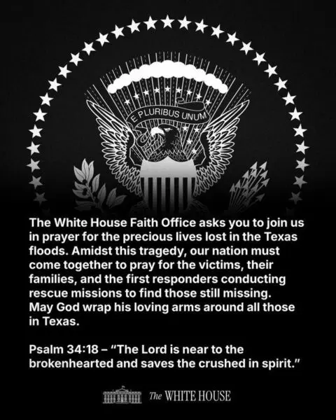 The White House Faith Office issued an invitation to our nation saying, “The White House Faith Office asks you to join us in prayer for the precious lives lost in the Texas floods. Amidst this tragedy, our nation must come together to pray for the victims, their families, and the first responders conducting rescue missions to find those still missing. May God wrap his loving arms around all those in Texas.” The statement reminded all of us that “Psalm 34:18- ‘The Lord is near to the brokenhearted and saves the crushed in spirit.’”